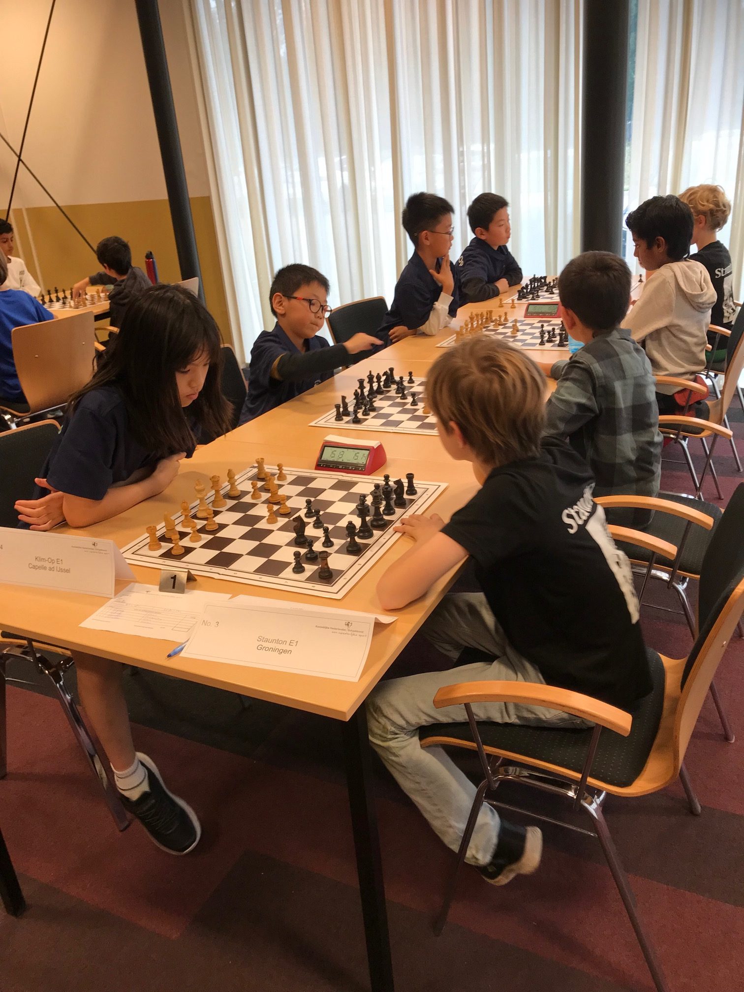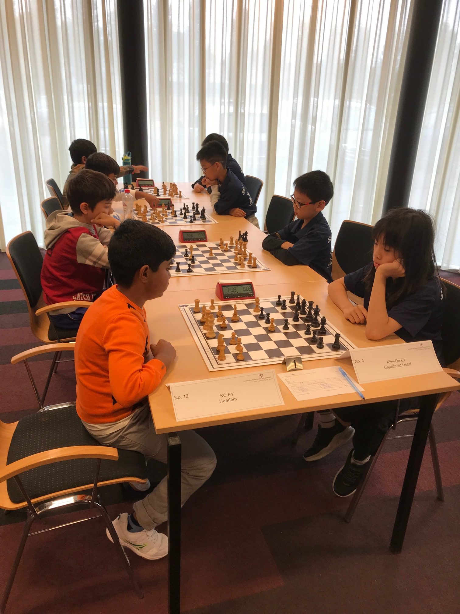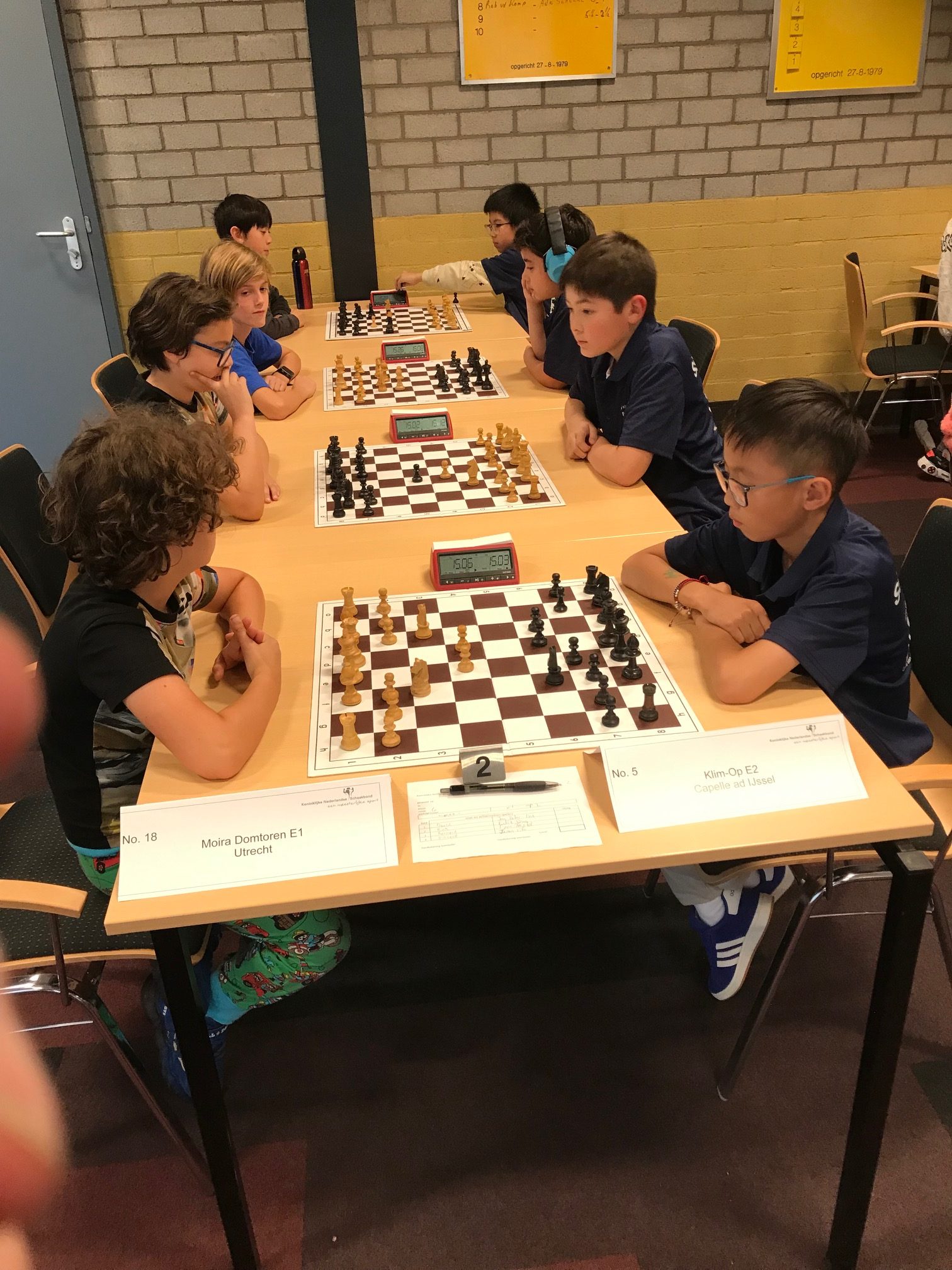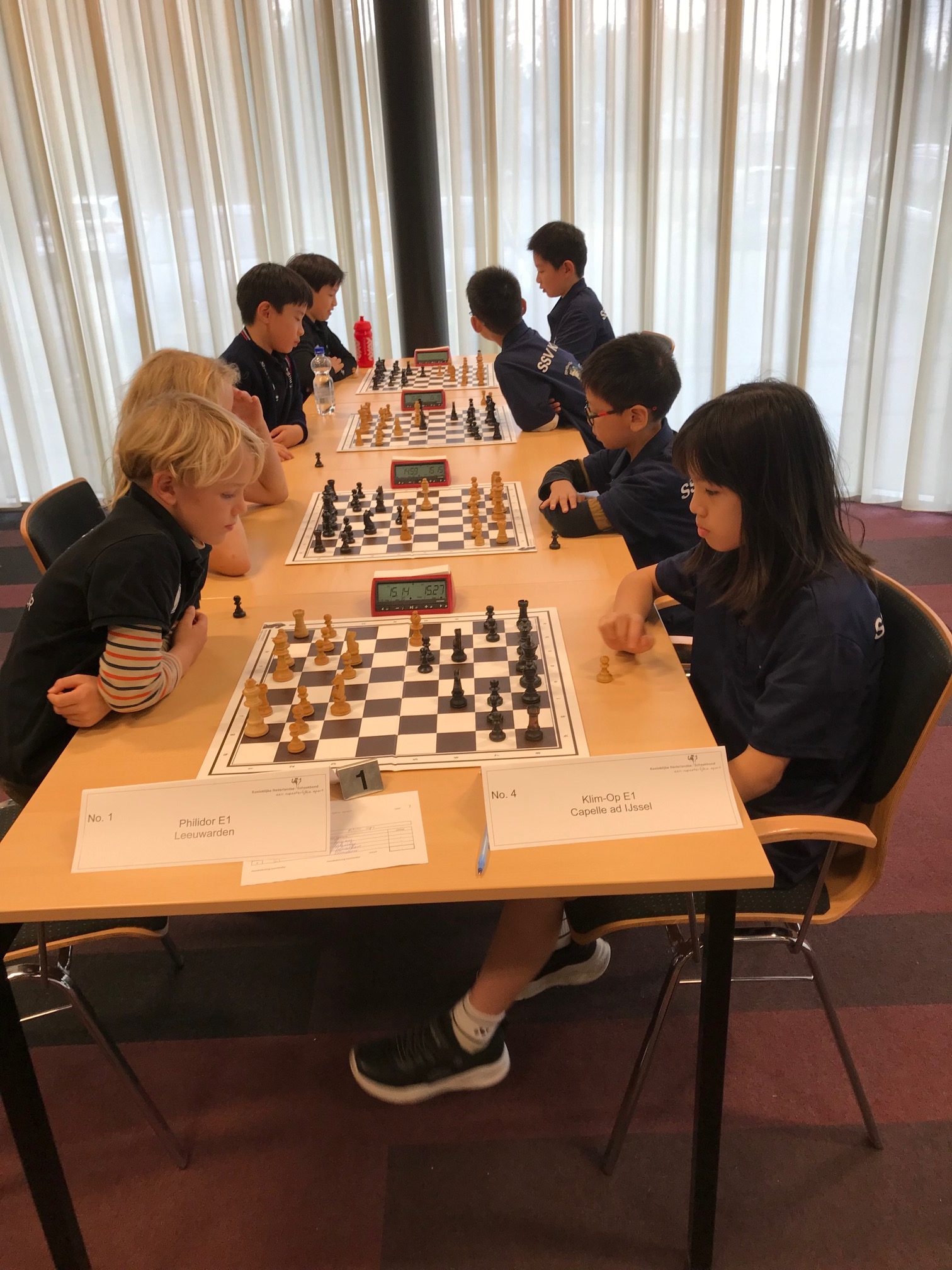 Op zaterdag 27 september werd in Almere de halve finale van het NK voor E-teams gehouden. Van de Klim-Op wisten twee teams zich te plaatsen voor deze halve finale. Dat is op zich al een mooie prestatie. Daarbij komt ook nog, dat beide teams dominant waren! Er werden 7 ronden gespeeld met een bedenktijd van 15 minuten + 5 seconden per zet. Beide Klim-Op-teams verloren geen enkele ronde. In de vierde ronden moesten ze tegen elkaar en uit tactisch oogpunt is het dan het beste om gelijk te spelen. Dat gebeurde op mijn verzoek ook. Zo hadden beide teams nog kans om zich voor de finale te plaatsen. Klim-Op E1 won 6 ronden en speelde dus tegen hun tweede team gelijk. Dat betekende een duidelijke eerste plaats. Het team scoorde 13 matchpunten en 25 bordpunten. Klim-Op E2 eindigde op een mooie tweede plaats met 11 matchpunten en 18 bordpunten. Mooie prestaties van onze teams! De scores van beide teams per bord: Klim-Op E1: 1. Ziyang – 5,5 uit 7; 2. Ziqing – 6,5 uit 7; 3. Jonathan – 6,5 uit 7 en 4. Doudou – 6,5 uit 7. Klim-Op E2: 1. Jan Peter – 2 uit 7; 2. Ediz – 5,5 uit 7; 3. Fynn – 4,5 uit 7 en 4. Jason – 6 uit 7. Voor mij ook opvallend de dominantie van onze teams! Toch waren gerenommeerde teams als Op Eigen Wieken, Almere, Kennemer Combinatie en Philidor aanwezig. Op 15 november wordt de finale van het NK E-teams gespeeld in Leiden en zijn dus onze beide E-teams aanwezig. Gefeliciteerd! Ouders weer bedankt voor het vervoer en de begeleiding!