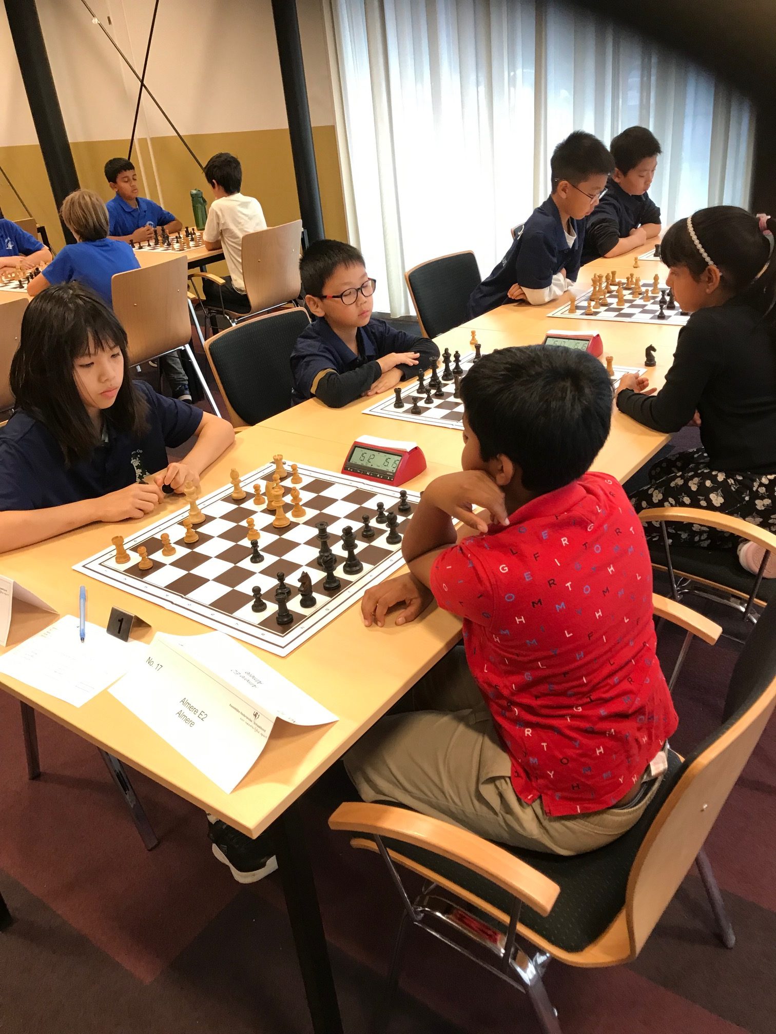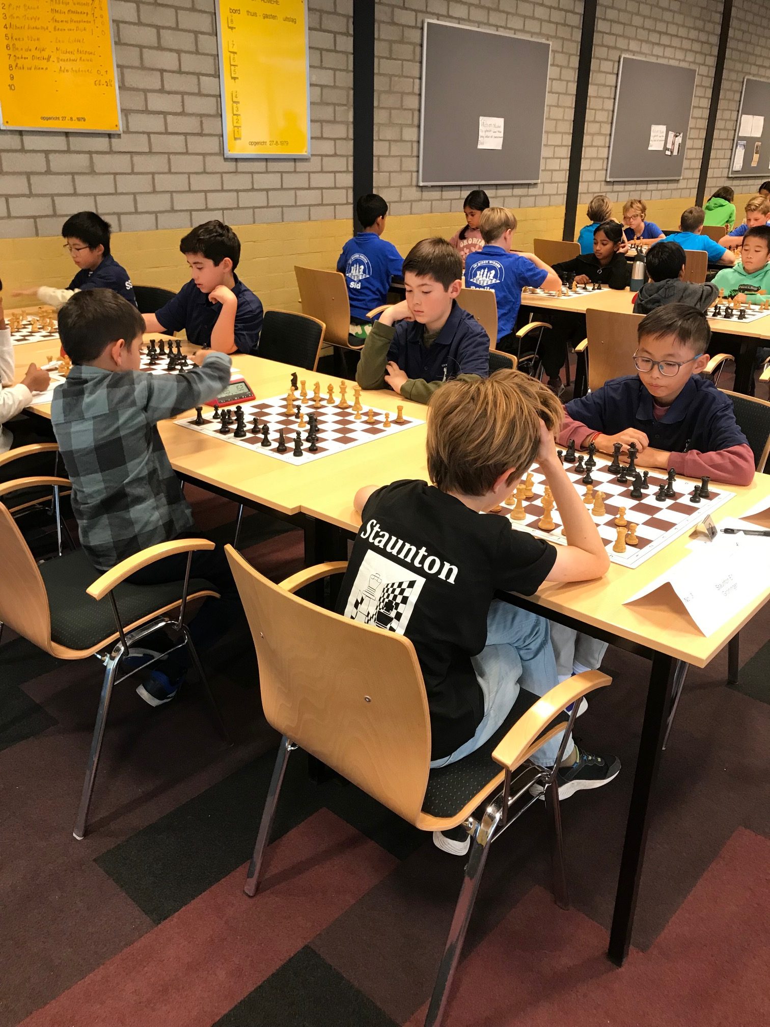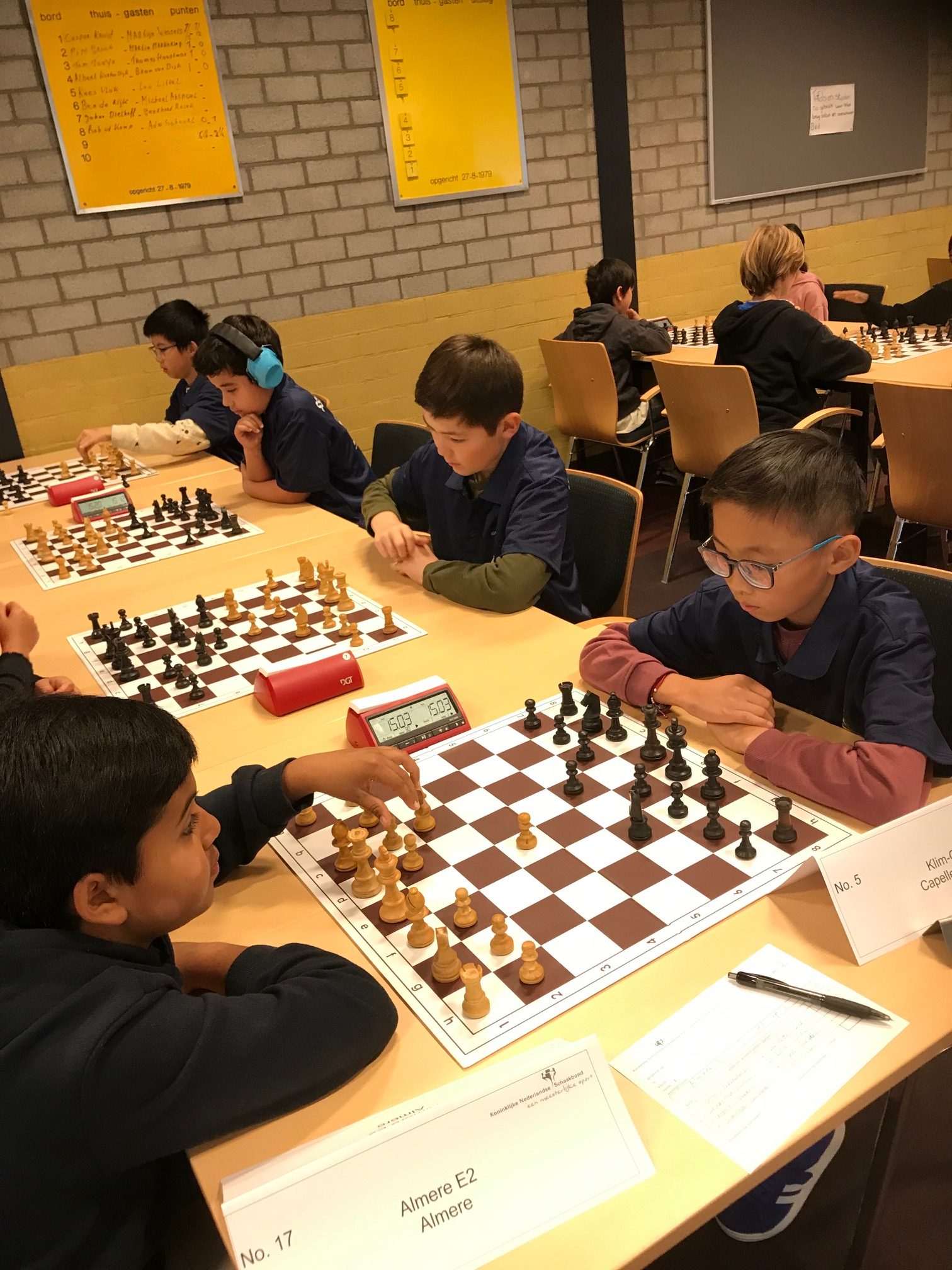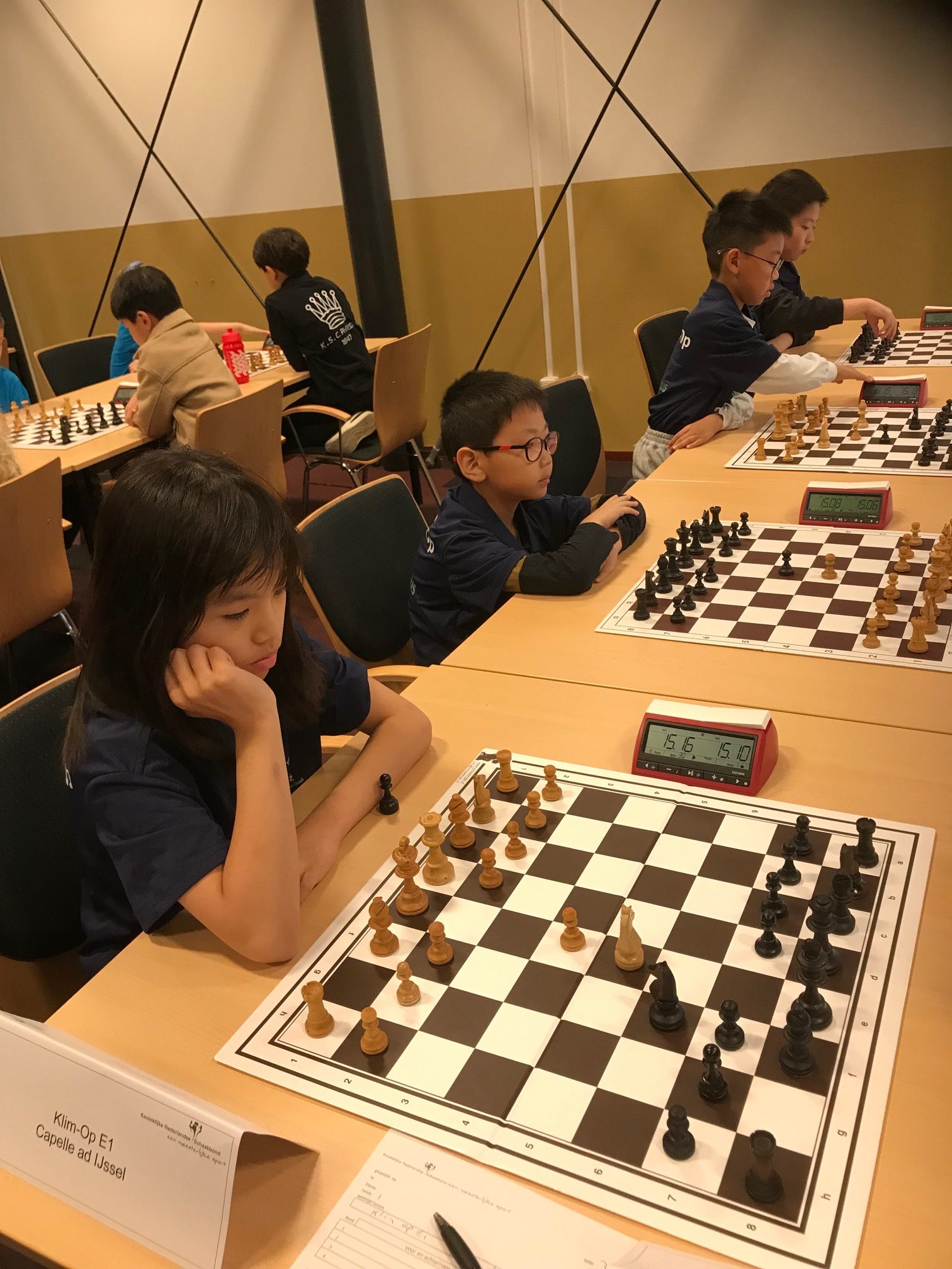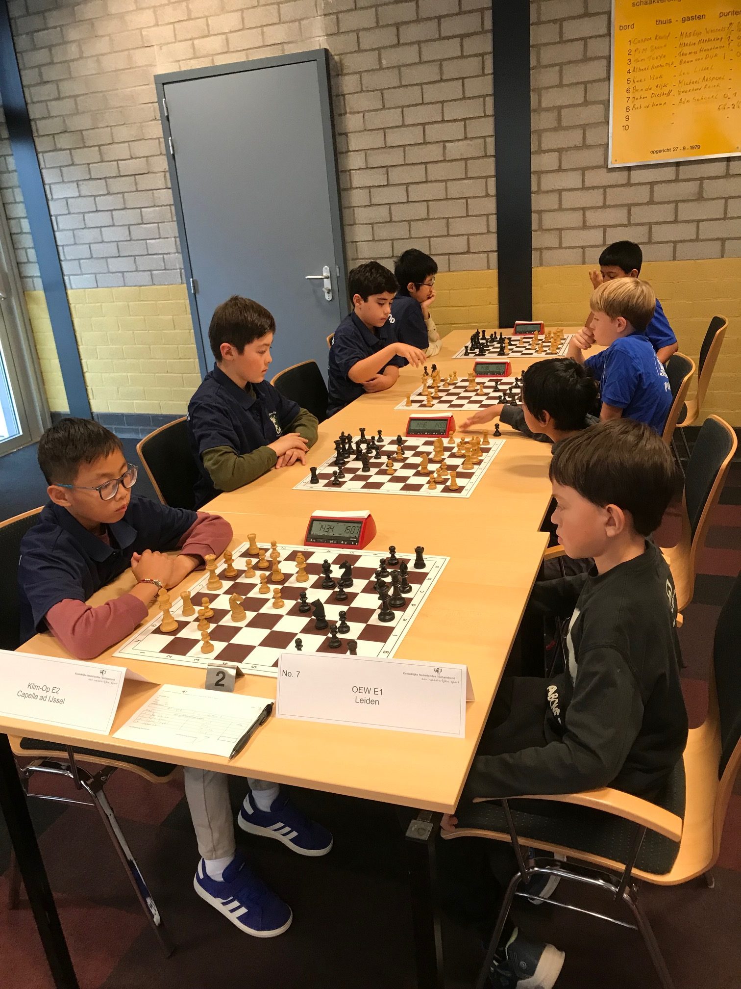 Op zaterdag 27 september werd in Almere de halve finale van het NK voor E-teams gehouden. Van de Klim-Op wisten twee teams zich te plaatsen voor deze halve finale. Dat is op zich al een mooie prestatie. Daarbij komt ook nog, dat beide teams dominant waren! Er werden 7 ronden gespeeld met een bedenktijd van 15 minuten + 5 seconden per zet. Beide Klim-Op-teams verloren geen enkele ronde. In de vierde ronden moesten ze tegen elkaar en uit tactisch oogpunt is het dan het beste om gelijk te spelen. Dat gebeurde op mijn verzoek ook. Zo hadden beide teams nog kans om zich voor de finale te plaatsen. Klim-Op E1 won 6 ronden en speelde dus tegen hun tweede team gelijk. Dat betekende een duidelijke eerste plaats. Het team scoorde 13 matchpunten en 25 bordpunten. Klim-Op E2 eindigde op een mooie tweede plaats met 11 matchpunten en 18 bordpunten. Mooie prestaties van onze teams! De scores van beide teams per bord: Klim-Op E1: 1. Ziyang – 5,5 uit 7; 2. Ziqing – 6,5 uit 7; 3. Jonathan – 6,5 uit 7 en 4. Doudou – 6,5 uit 7. Klim-Op E2: 1. Jan Peter – 2 uit 7; 2. Ediz – 5,5 uit 7; 3. Fynn – 4,5 uit 7 en 4. Jason – 6 uit 7. Voor mij ook opvallend de dominantie van onze teams! Toch waren gerenommeerde teams als Op Eigen Wieken, Almere, Kennemer Combinatie en Philidor aanwezig. Op 15 november wordt de finale van het NK E-teams gespeeld in Leiden en zijn dus onze beide E-teams aanwezig. Gefeliciteerd! Ouders weer bedankt voor het vervoer en de begeleiding!