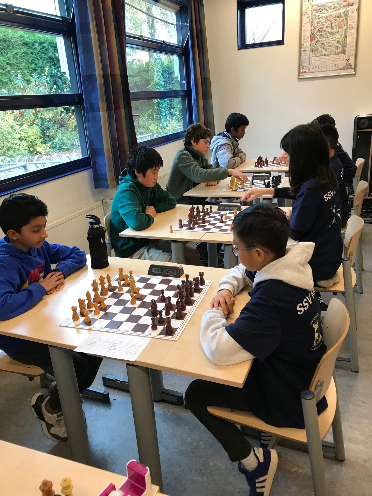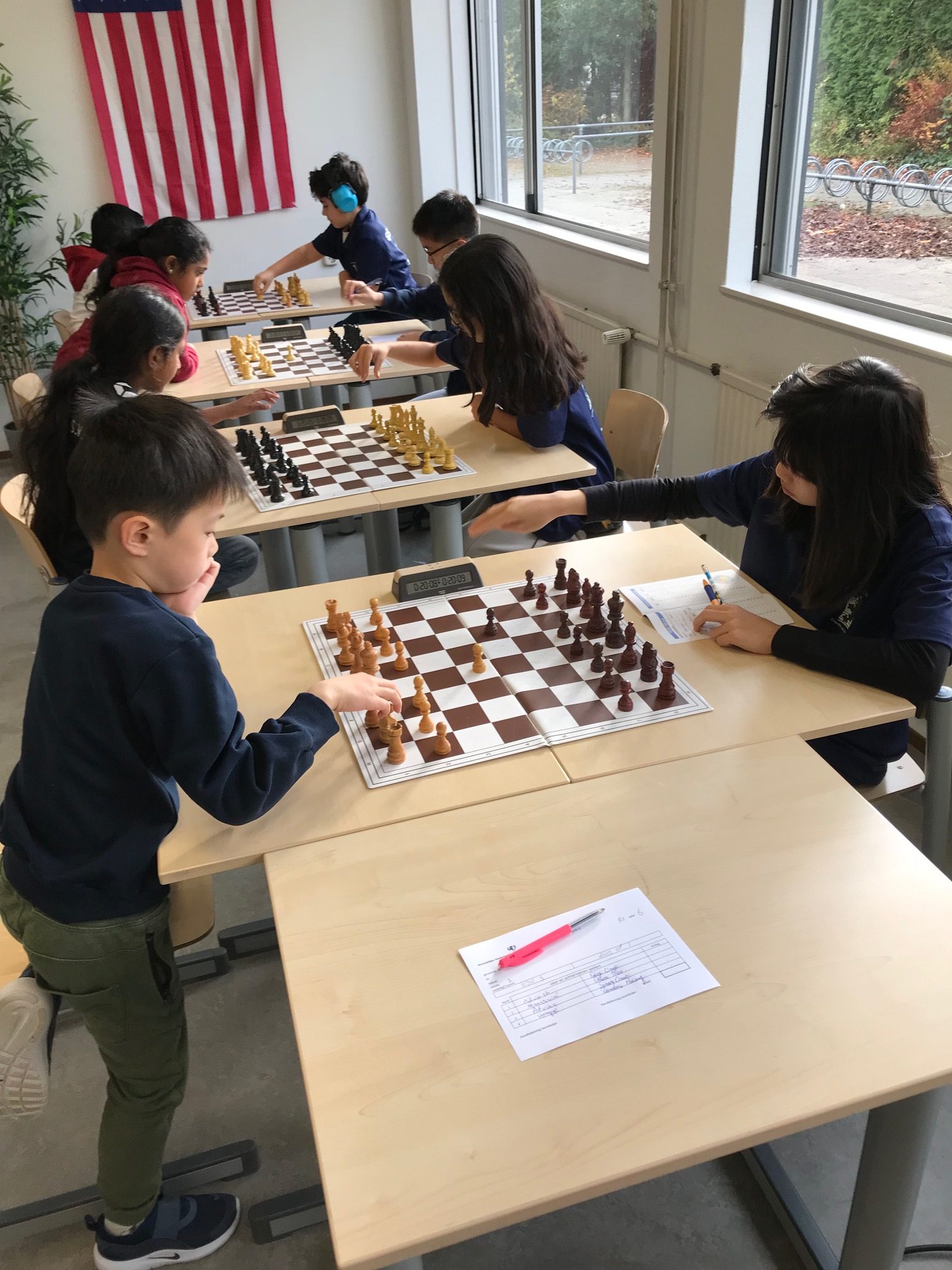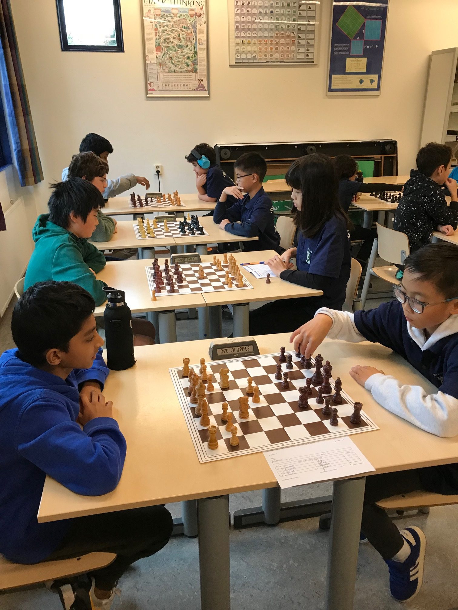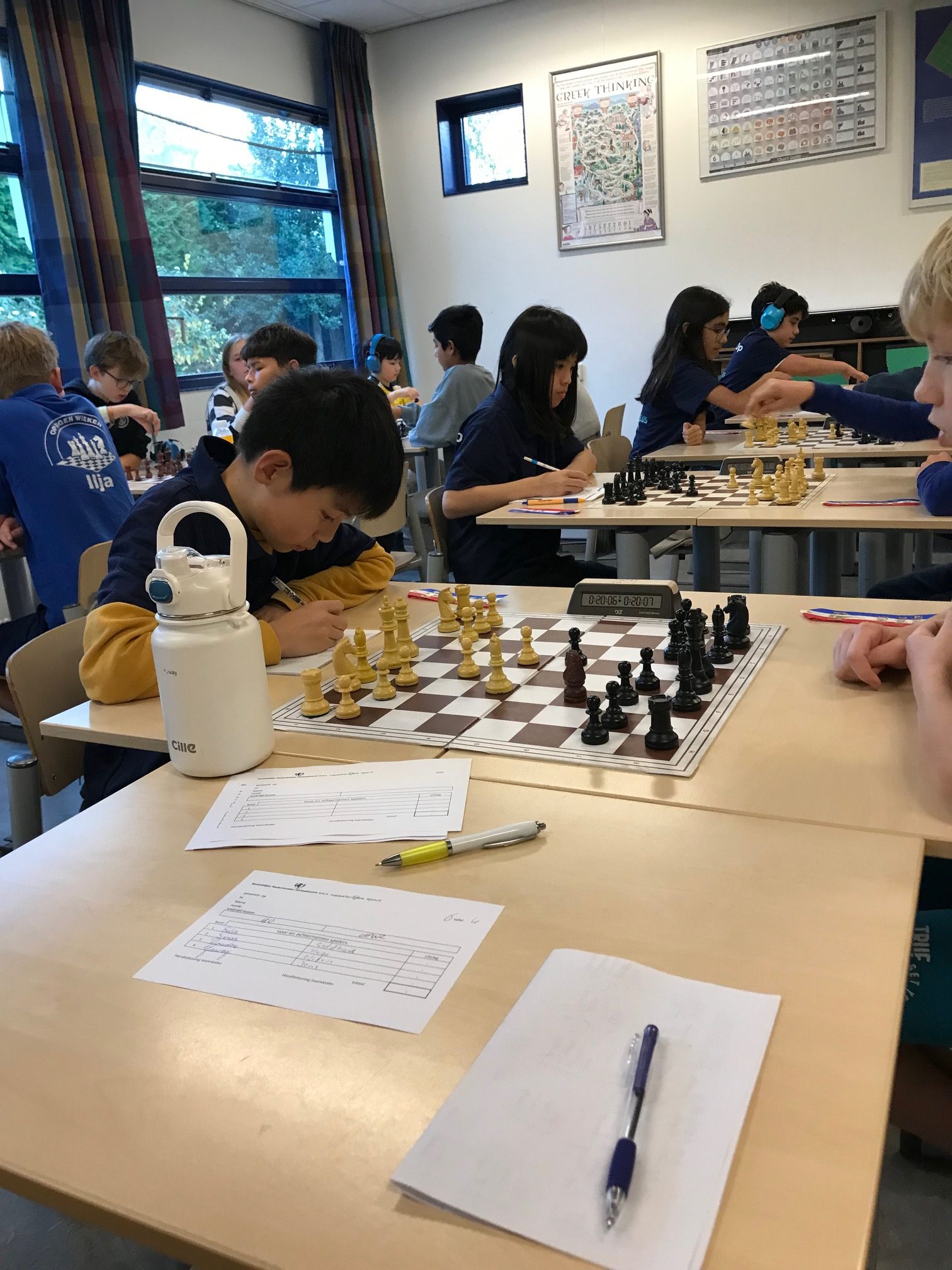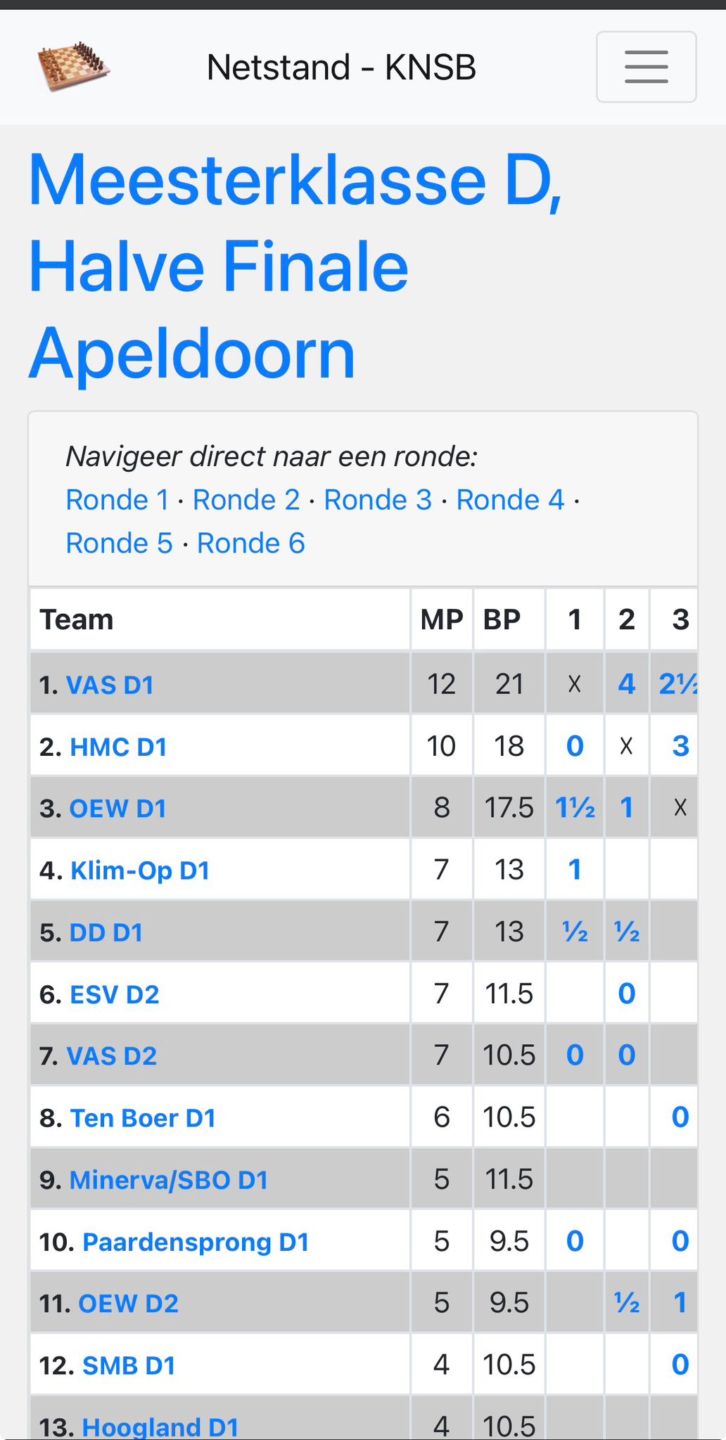 Op zaterdag 8 november werd in Apeldoorn de halve finale van het NK voor D-teams (tot 12 jaar) gehouden. Klim-Op D1 had zich voor deze finale geplaatst. Het team bestaat uit Ediz, Ethan, Siraz, Doudou, Jason en Yuway. Er werden 6 ronden gespeeld met een bedenktijd van 20 minuten + 5 seconden per zet p.p.p.p. De eerste zes teams in deze halve finale zouden zich voor de finale plaatsen, die op zaterdag 6 december wordt gehouden. Onze denkhoofden gingen er eens goed voor zitten. Er waren dus 6 Klim-Oppers aanwezig en er werd dus telkens gewisseld, zodat ieder minstens drie partijen kon spelen. Het zorgde ook voor de nodige rust tussendoor voor de denkhoofden. Het werd erg spannend! Na 5 ronden stond ons team op de zesde plaats, genoeg dus voor de finale, maar Op Eigen Wieken wachtte in de laatste ronde. Bij winst zouden we doorgaan, maar bij verlies waren we uitgeschakeld. Ediz, Siraz, Doudou en Yuway moesten het in die laatste ronde doen. Yuway verloor al vrij snel en de andere drie moesten dus een tandje bijzetten. Doudou maakte netjes gelijk. Siraz stond goed, maar had ze wel oog voor haar tijd? Ja, dat had ze en ze won. Ediz had aan remise genoeg, maar hij schoof de partij heel goed uit: 3 – 1! De finale was bereikt, die op 6 december plaats vindt! Uiteindelijk leverde dat ons de vierde plaats op in deze halve finale. Een knappe prestatie! De scores waren: Ediz op bord 1 (!): 2 uit 5; Ethan op bord 2 en 1: 2 uit 4; Siraz op bord 2 en 3: 3 uit 4; Doudou op bord 4 en 3: 3 uit 4; Jason op bord 4 en 3: 2 uit 4 en Yuway op bord 4: 1 uit 3. Ouders, ontzettend bedankt voor het vervoer en de begeleiding!