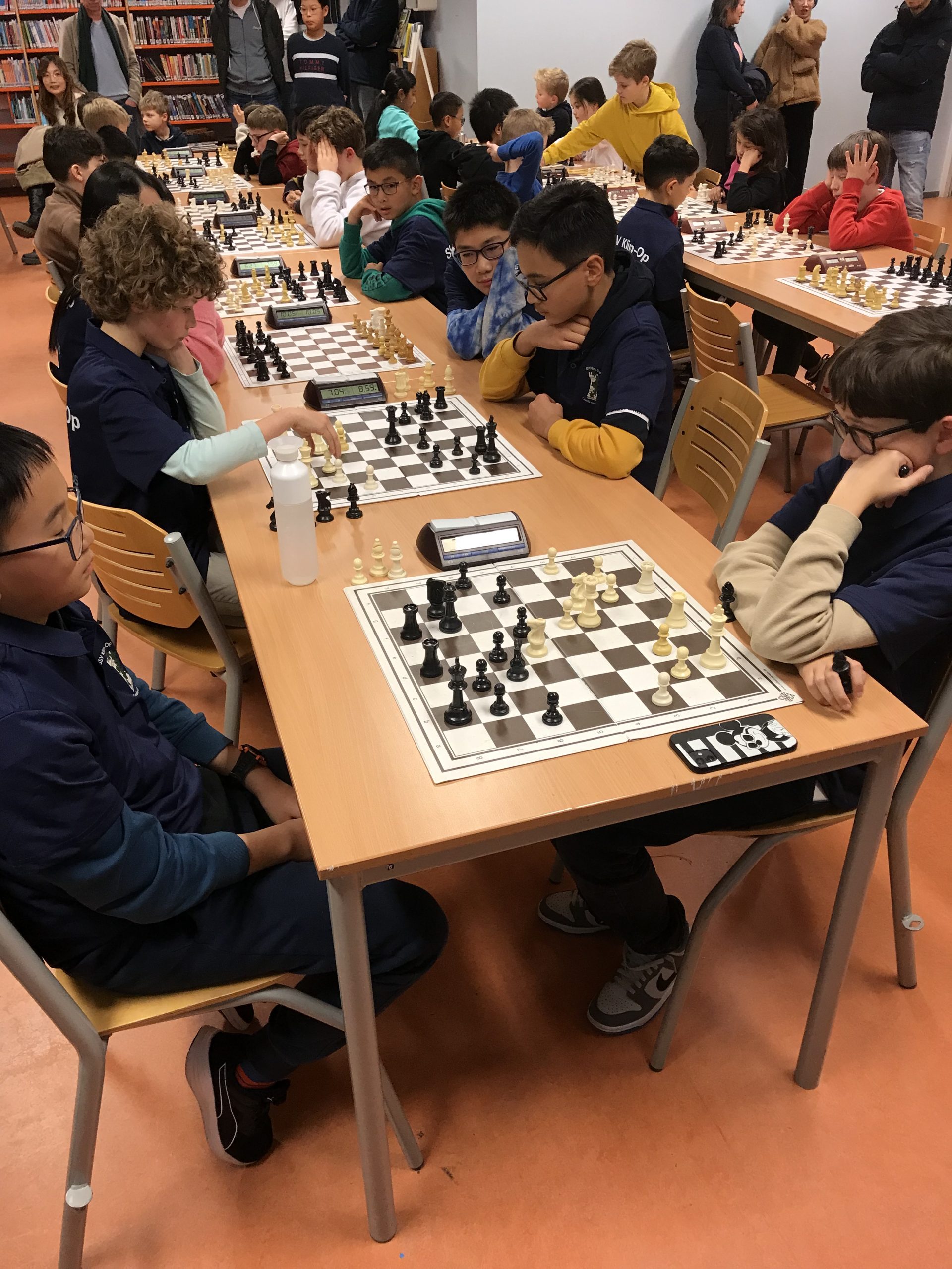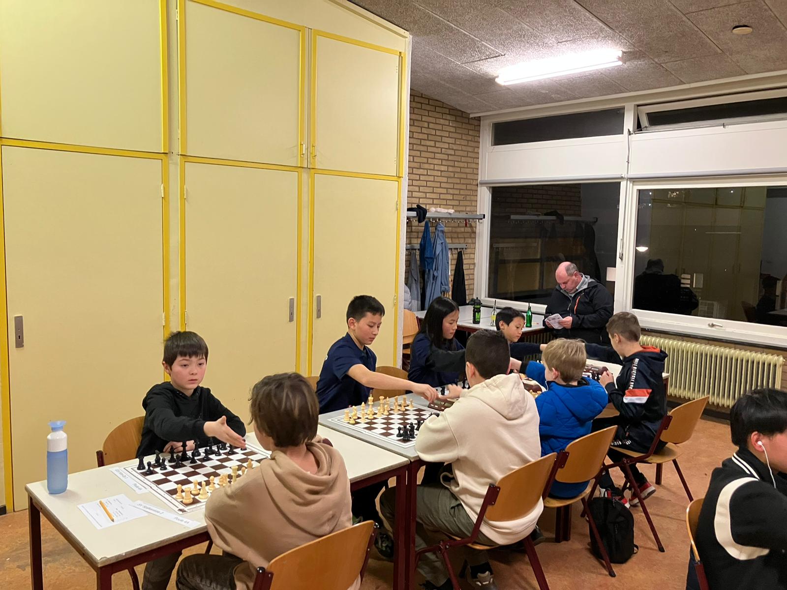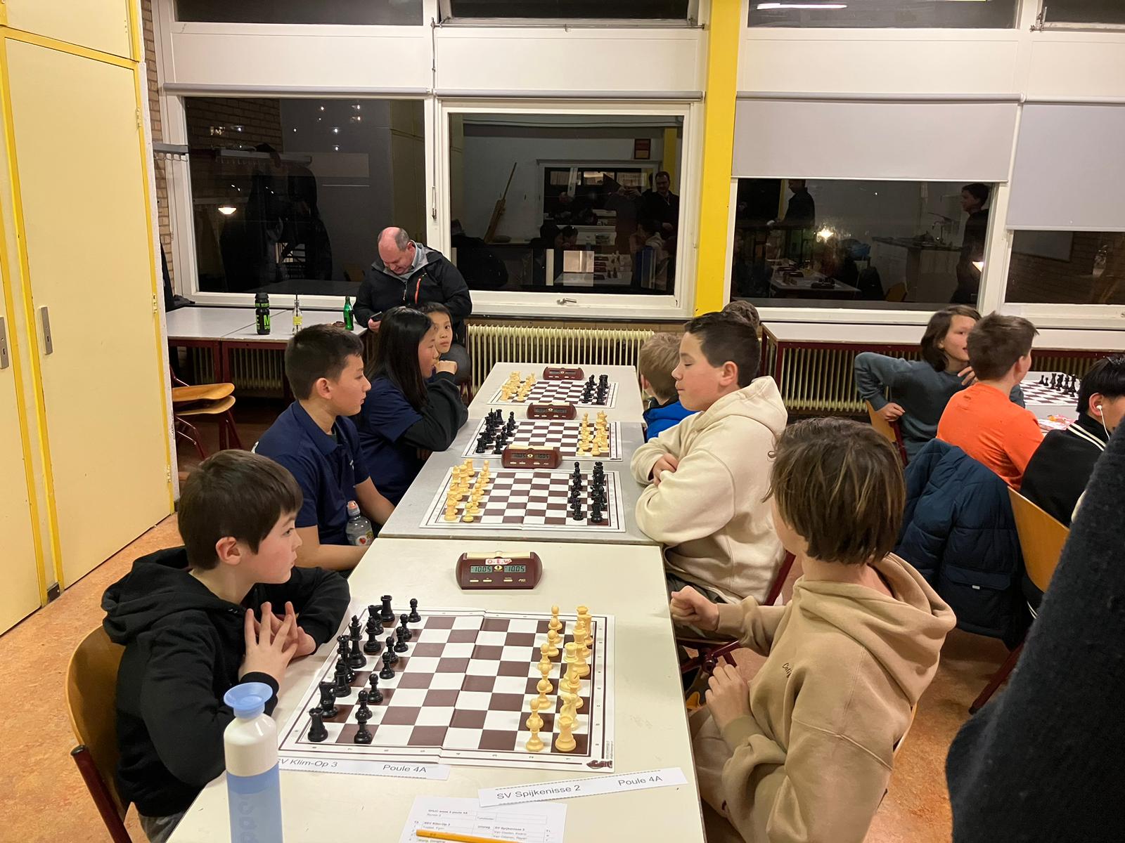 Op vrijdagavond 2 februari werd de vijfde speelavond van de Groene Hart Cup afgewerkt. Drie van onze teams speelden thuis. Alleen Klim-Op 3 moest naar “Op Eigen Wieken” in Leiden. Ons “vlaggenschip”, Klim-Op 1, speelde thuis in poule 2. Ook Klim-Op 2 schaakte in deze poule. De Pionnetjes 1 en Messemaker 2 maakten de groep compleet. Het werd een strijd tussen De Pionnetjes en Klim-Op. Uiteindelijk eindigden ze beiden op 10 bordpunten. Dan zegt het reglement, dat bord 4 vervalt in de onderlinge wedstrijd. Toen was Klim-Op 1 de gelukkige. Ons team bestond uit: bord 1. Denis – 2 uit 3, bord 2 – Kai: 3 uit 3 (!), bord 3 – Bryan: 3 uit 3 (!) en bord 4 – Ethan: 2 uit 3. Volgende keer gaan zij weer in de hoogste poule strijden. Klim-Op 2 kon in dit geweld niet mee. Het team bestond uit: William, Gijs, Yaxin en Wim. Gijs wist een keer te winnen en Yaxin speelde een keer remise. Dit team gaat de volgende keer in poule 3 spelen. Klim-Op 4 speelde ook thuis in poule 5. Deze jonge denkhoofden doen het best goed, maar moeten nog proberen de concentratie vast te houden. Ze wonnen twee keer met 4 – 0, maar verloren ook een keer met 0 – 4. Ze handhaven zich hierdoor in poule 5. Het team bestond uit: Ziqing – 2 uit 3, Jonathan – 2 uit 3, Olivia – 2 uit 3, Karan – 2 uit 2 en Ibraheem – 0 uit 1. Klim-Op 3 moest zoals gezegd naar Leiden. Wendun, vader van Haitong en Dongling, begeleidde dit team. Erg bedankt, Wendun! Het team eindigde met 6,5 bordpunt op de tweede plaats in de poule en handhaafde zich dus in deze poule. Het viertal bestond uit: 1. Fynn (3 uit 3!), 2. Omayr (1 uit 3), 3. Haitong (2 uit 3) en 4. Dongling (0,5 uit 3). Ouders, weer bedankt voor de begeleiding. In het bijzonder Wendun en Davy, ook voor het vervoer en Wendun ook nog voor de foto’s. De volgende speelavond is vrijdagavond 1 maart.