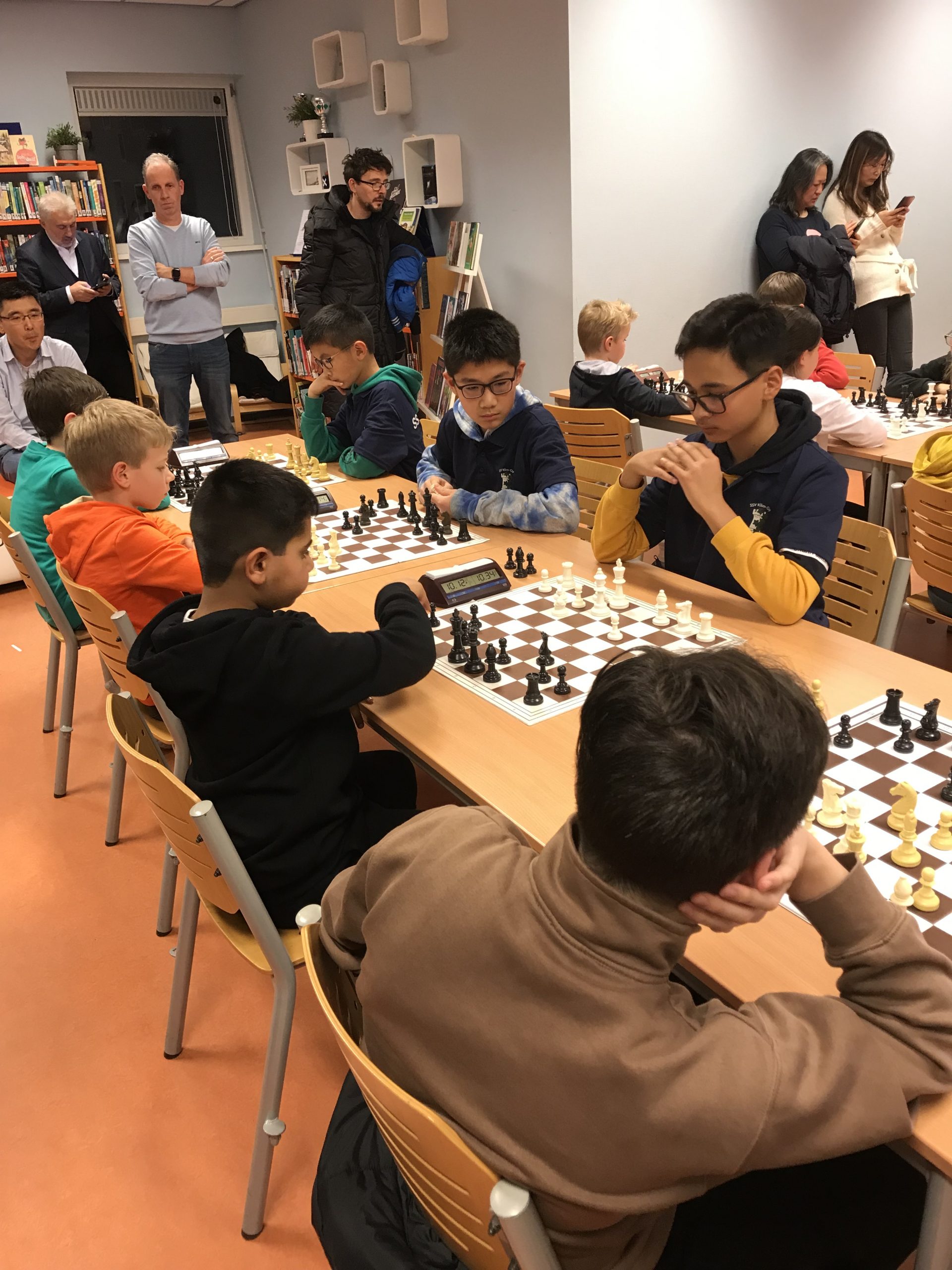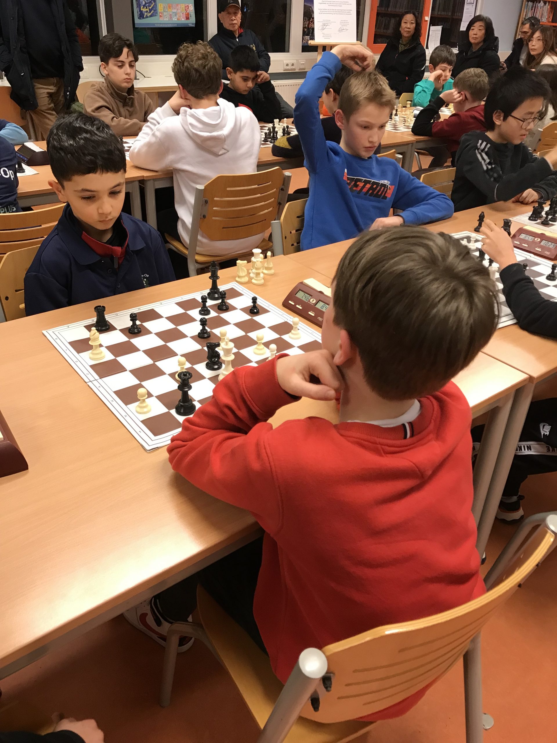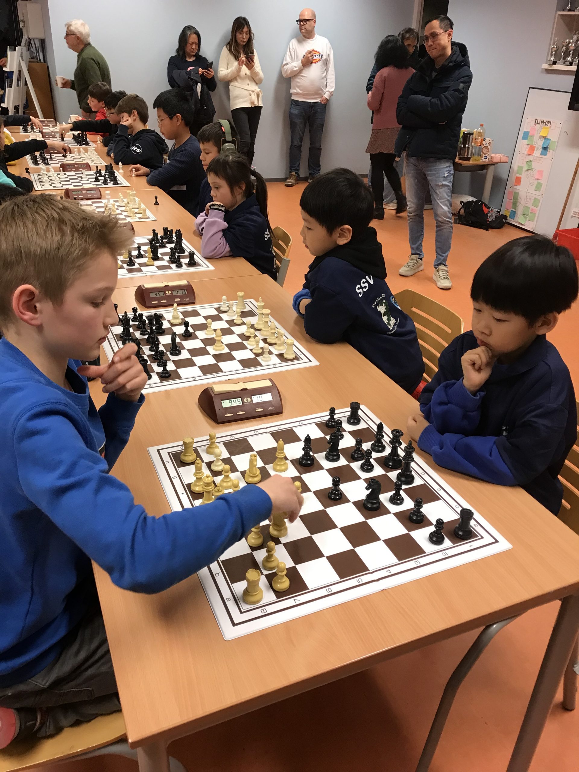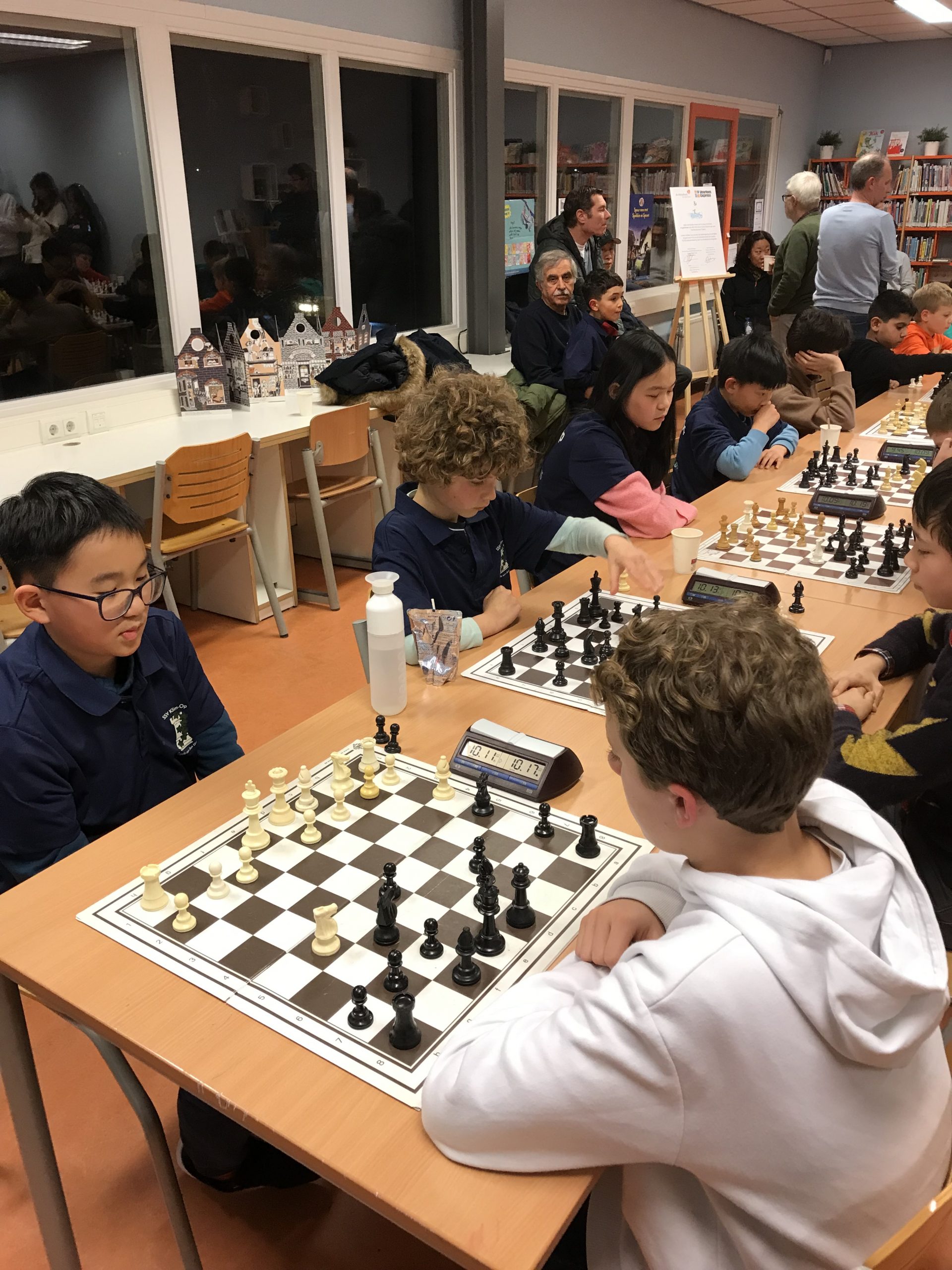 Op vrijdagavond 2 februari werd de vijfde speelavond van de Groene Hart Cup afgewerkt. Drie van onze teams speelden thuis. Alleen Klim-Op 3 moest naar “Op Eigen Wieken” in Leiden. Ons “vlaggenschip”, Klim-Op 1, speelde thuis in poule 2. Ook Klim-Op 2 schaakte in deze poule. De Pionnetjes 1 en Messemaker 2 maakten de groep compleet. Het werd een strijd tussen De Pionnetjes en Klim-Op. Uiteindelijk eindigden ze beiden op 10 bordpunten. Dan zegt het reglement, dat bord 4 vervalt in de onderlinge wedstrijd. Toen was Klim-Op 1 de gelukkige. Ons team bestond uit: bord 1. Denis – 2 uit 3, bord 2 – Kai: 3 uit 3 (!), bord 3 – Bryan: 3 uit 3 (!) en bord 4 – Ethan: 2 uit 3. Volgende keer gaan zij weer in de hoogste poule strijden. Klim-Op 2 kon in dit geweld niet mee. Het team bestond uit: William, Gijs, Yaxin en Wim. Gijs wist een keer te winnen en Yaxin speelde een keer remise. Dit team gaat de volgende keer in poule 3 spelen. Klim-Op 4 speelde ook thuis in poule 5. Deze jonge denkhoofden doen het best goed, maar moeten nog proberen de concentratie vast te houden. Ze wonnen twee keer met 4 – 0, maar verloren ook een keer met 0 – 4. Ze handhaven zich hierdoor in poule 5. Het team bestond uit: Ziqing – 2 uit 3, Jonathan – 2 uit 3, Olivia – 2 uit 3, Karan – 2 uit 2 en Ibraheem – 0 uit 1. Klim-Op 3 moest zoals gezegd naar Leiden. Wendun, vader van Haitong en Dongling, begeleidde dit team. Erg bedankt, Wendun! Het team eindigde met 6,5 bordpunt op de tweede plaats in de poule en handhaafde zich dus in deze poule. Het viertal bestond uit: 1. Fynn (3 uit 3!), 2. Omayr (1 uit 3), 3. Haitong (2 uit 3) en 4. Dongling (0,5 uit 3). Ouders, weer bedankt voor de begeleiding. In het bijzonder Wendun en Davy, ook voor het vervoer en Wendun ook nog voor de foto’s. De volgende speelavond is vrijdagavond 1 maart.
