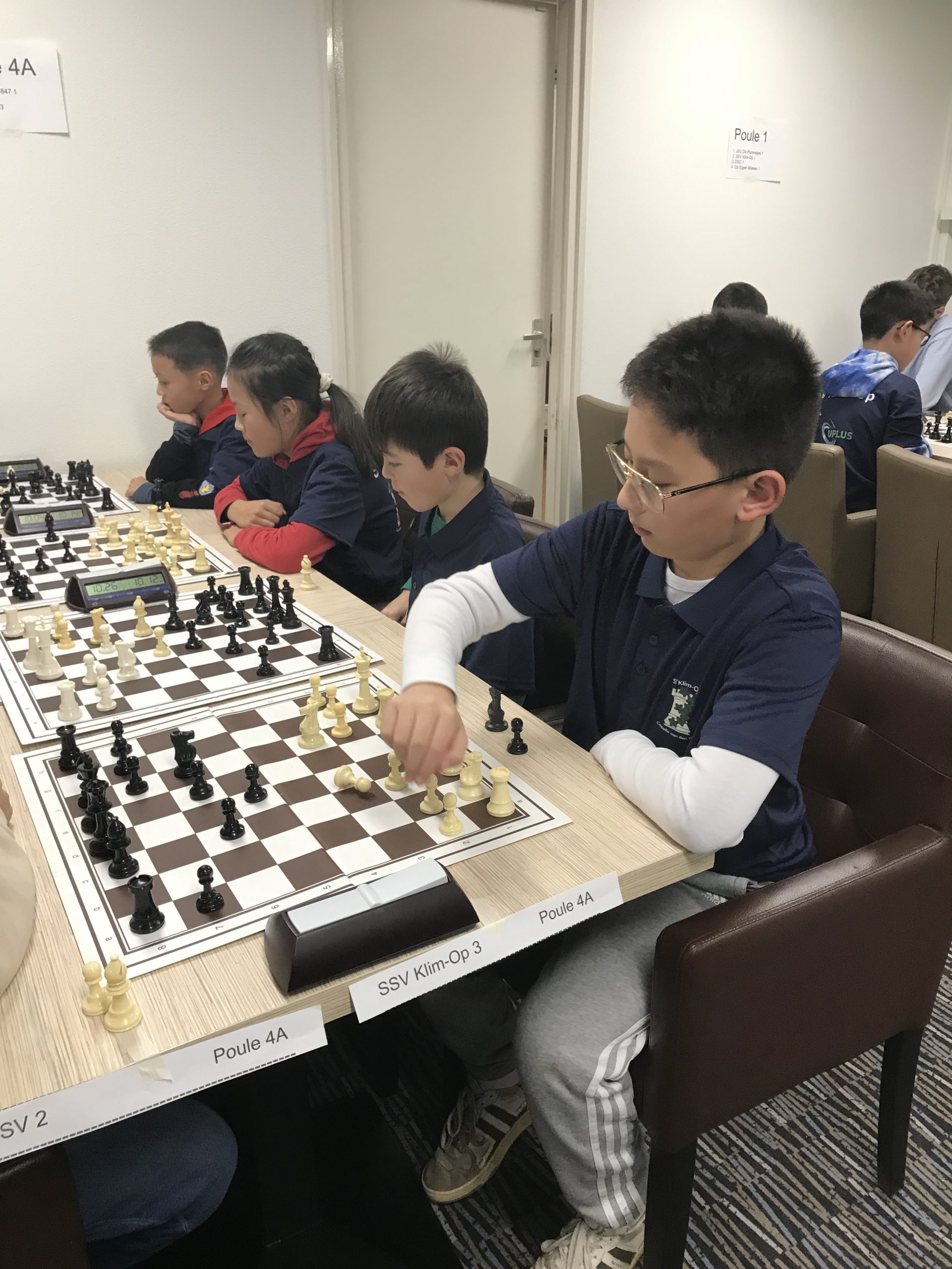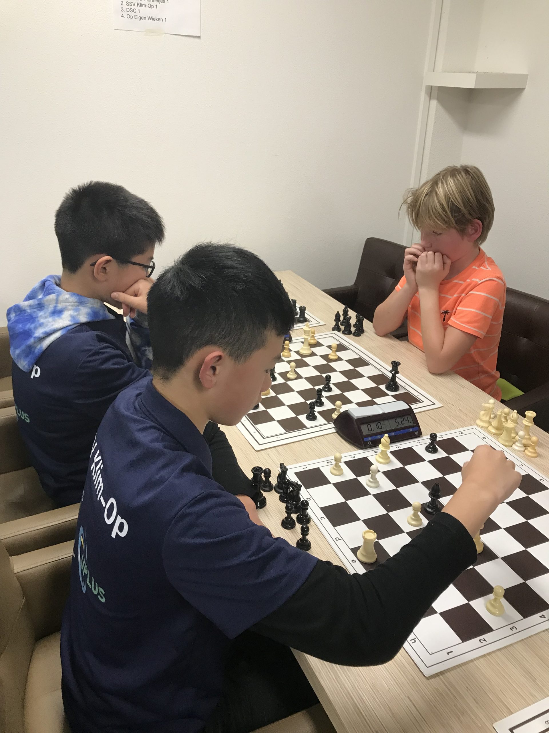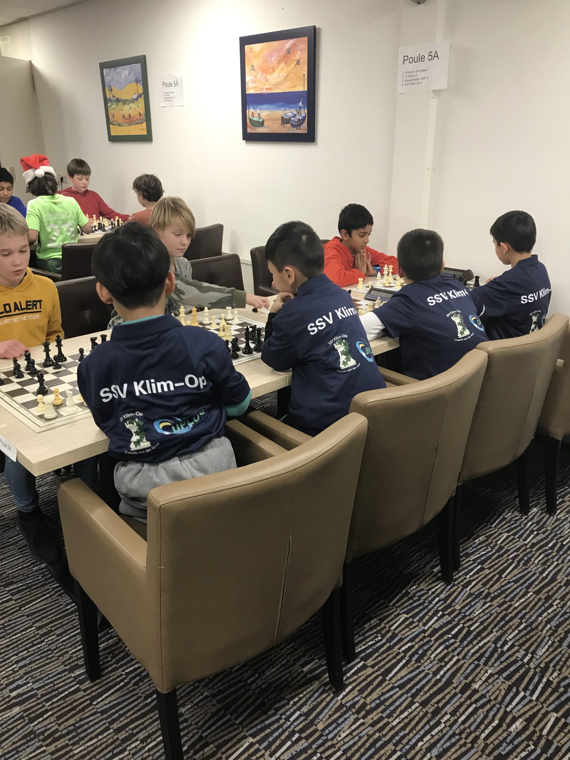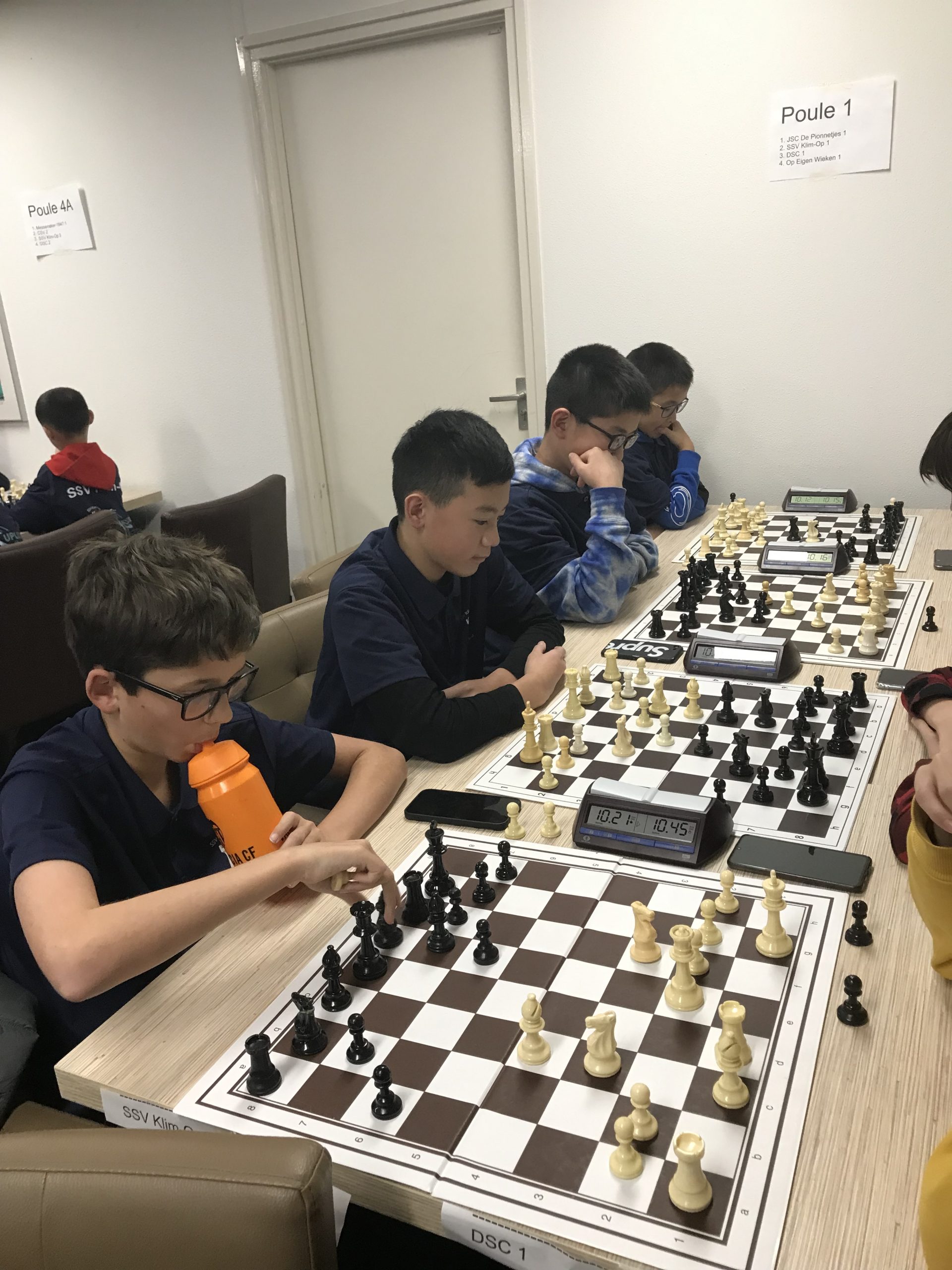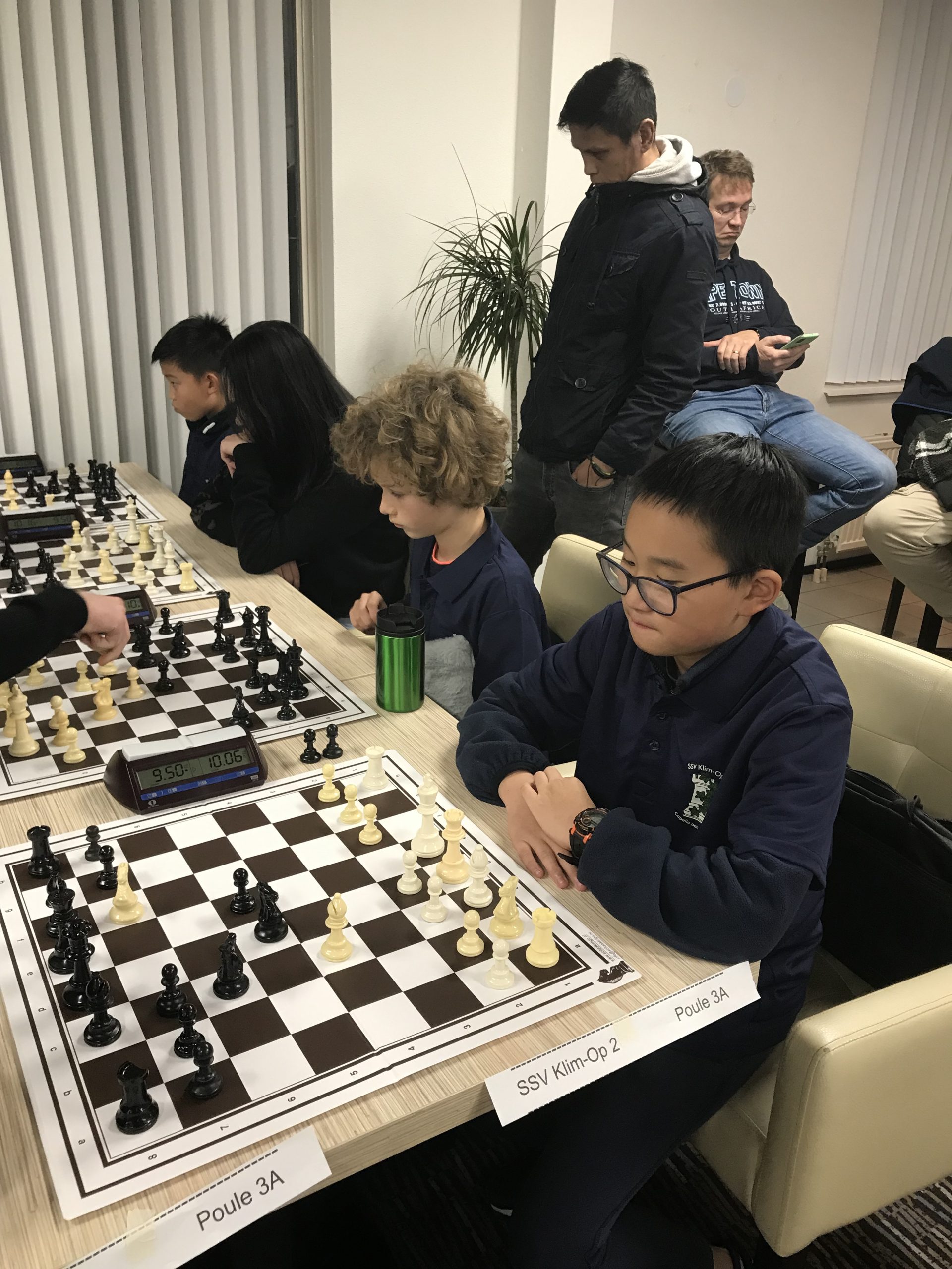Vrijdagavond 24 november werd de derde speeldag van de Groene Hart Cup gespeeld. Onze vier teams moesten alle vier naar het Denksportcentrum in Gouda. Leuk was, dat onze teams in de clubpolo speelden. Er waren complimenten van de andere teamleiders. Ons “vlaggenschip”, Klim-Op 1, had het zwaar. Dat wisten ze ook wel, want de vorige keer wisten zij zich net staande te houden in de hoogste poule. Dat lukte nu net niet. Ze kwamen nu een punt tekort. De scores waren: bord 1 – Denis: 1 uit 3; bord 2 – Noah: 1 uit 3; bord 3 – Bryan: 2 uit 3 en bord 4 – Ethan: 2 uit 3. Ethan leed zijn eerste nederlaag in deze competitie, maar staat nog altijd hoog in de persoonlijke scores. Klim-Op 2 wist zich in poule 3 met 6,5 punt te handhaven. Hier waren de scores: bord 1 – William: 2 uit 3; bord 2 – Gijs: 1 uit 3; bord 3 – Yaxin: 1,5 uit 3 en bord 4 – Wim: 2 uit 3. Klim-Op 3 draait ook mee in poule 3 en kwam tot 6 punten. Ook nu wist Haitong haar 3 partijen keurig te winnen. Knap, Haitong! Omayr kwam op bord 1 tot 1 uit 3, Fynn op bord 2 smaakte niet het zoet van de overwinning en Dongling op bord 4 scoorde 2 uit 3. Klim-Op 4 miste Olivia en dat was te merken. Gelukkig maakte Salih het viertal compleet. Het team kwam tot 5 punten en gaat de volgende keer een trapje lager spelen. Jonathan won zijn drie partijen en dat is een mooie prestatie! Ziqing op bord 1 eindigde op 2 uit 3 en ook dat is mooi. Ibrahim en Salih wisten niet te scoren. Salih bedankt, dat je kon invallen! Ouders weer bedankt voor het vervoer en de begeleiding!